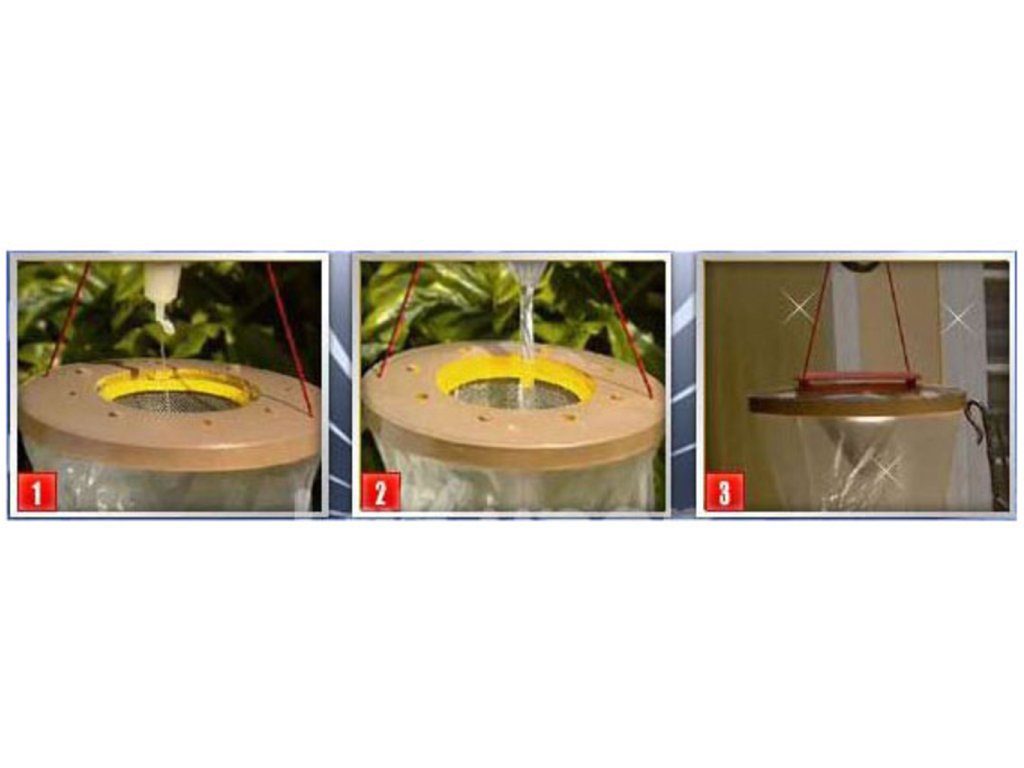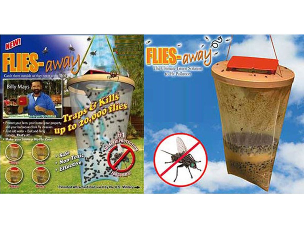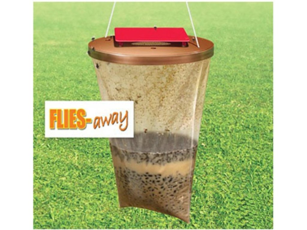Leto sa blíži as tým je spojených aj mnoho nepríjemností, ako sú muchy, komáre a iný hmyz , ktoré Vás môžu obťažovať počas Vášho grilovania. Chcete si v pokoji posedieť na záhrade a neoháňať sa čo chvíľu za hmyzom? Zaobstarajte si biologickú muchlapku FLIES Away . Biologická mucholapka FLIES Away je vhodná iba na vonkajšie použitie . Vďaka špeciálnej konštrukcie vletí hmyz dovnútra, ale už sa nezvládne dostať von. Stačí do vrecka zmiešať vopred pripravený suchý roztok s 1 litrom vody, naliať do mucholapky a pripevniť viečko. Je to ekologický spôsob a návnada neobsahuje žiadne chemické látky. Zaveste a užívajte si príjemné posedenie s priateľmi.