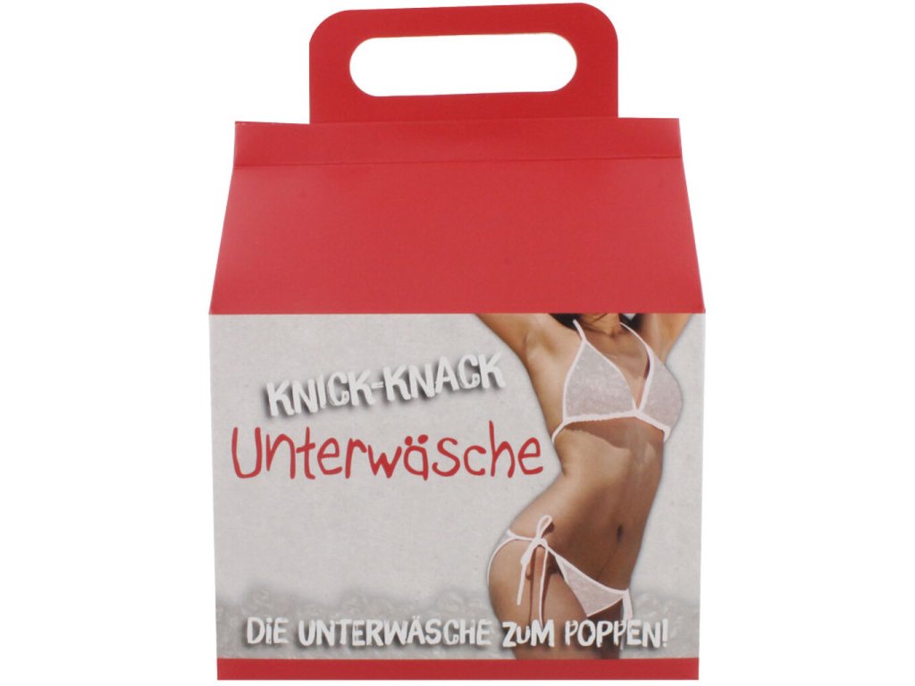 Spodná bielizeň z bublinkovej fólie. To znamená, že máte na sebe pravdepodobne najbezpečnejšiu spodnú bielizeň alebo nohavičky na svete! Darčekový predmet na rozlúčku so slobodou v podobe tejto darčekovej krabičky s frivolným obsahom: dámske bikiny (SL) z bublinkovej fólie sú hitom! Praskajúce bikiny! Každý, kto má rád bublinkovú fóliu, si zamiluje tieto bikiny: priehľadné bublinkové bikiny, ktoré sa dajú zviazať k sebe a vyhrnúť. Perfektný predmet na odbúranie stresu a skvelý darček.