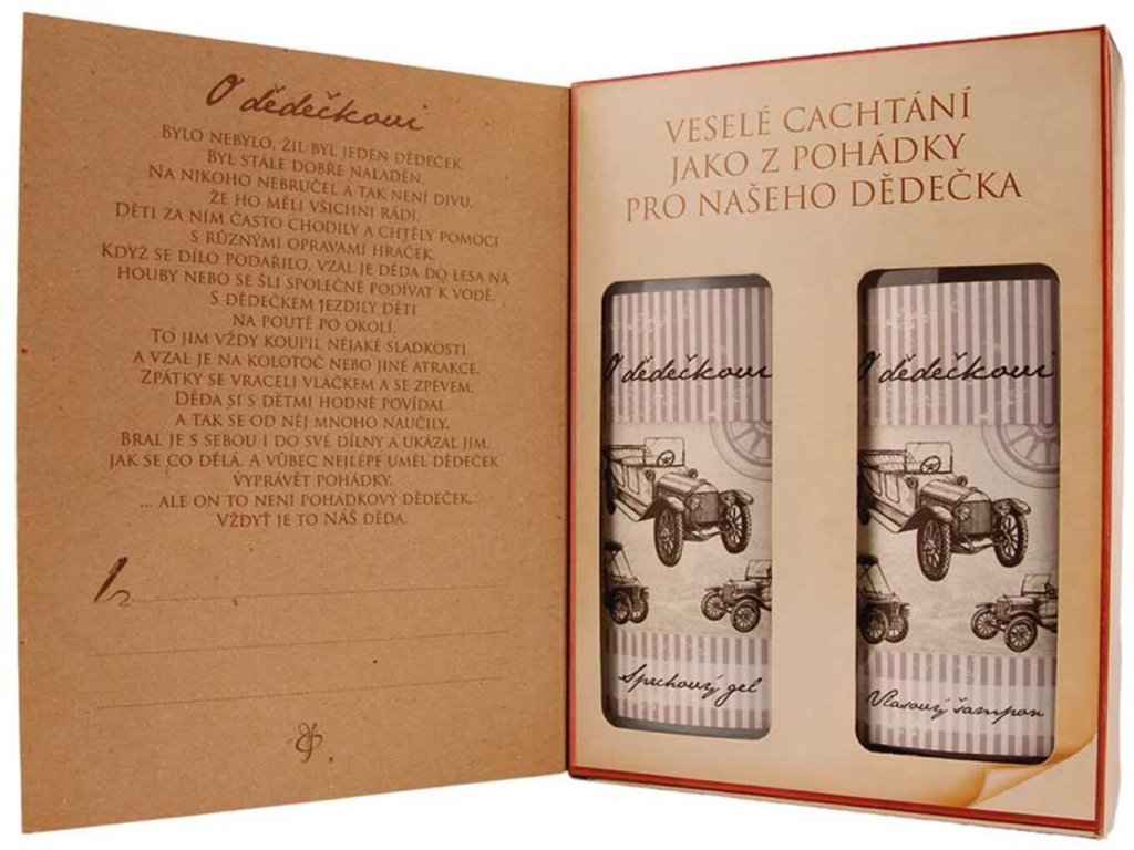 Darujte svojmu dedkovi túto nevšednú knižku . Darčekové balenie - kniha - Rozprávka o dedkovi je krásnym a milým darčekom pre potešenie srdiečka každého dedka . Na prvý pohľad sa zdá, že sa jedná o knižku . Vnútri sa však ukrýva sprchový gél a šampón . Na úvodnej strane nájdete sprievodný text a vtipy na rozprávkovú tému . Celé balenie je zladené do rozprávkového motívu . Sprchový gél a šampón obsahujú jemné umývacie zložky s olivovým olejom . Prípravky zaisťujú šetrné umývanie a prevenciu vysušovania pokožky. Zažite rozprávkový kúpeľ a starajte sa o svoju pokožku. Darčekové balenie - kniha - Rozprávka o deduškovi , je originálny darček pre všetky deduškov .