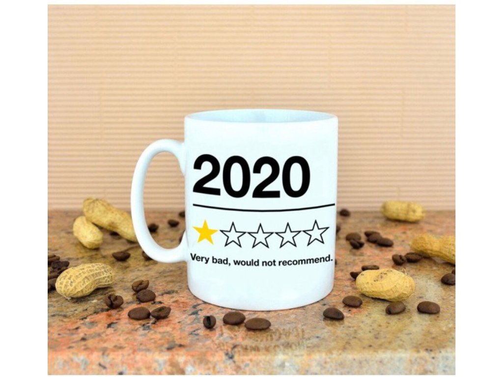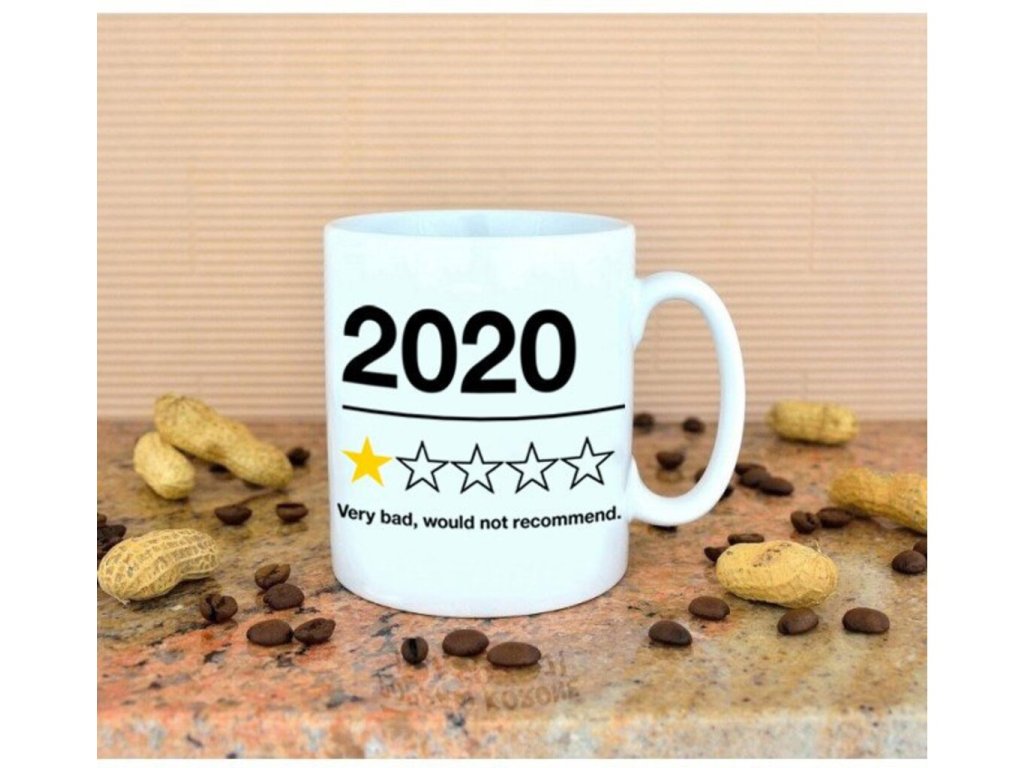 - porcelánový hrnček so slovami „2020 Veľmi zlý, neodporúčam