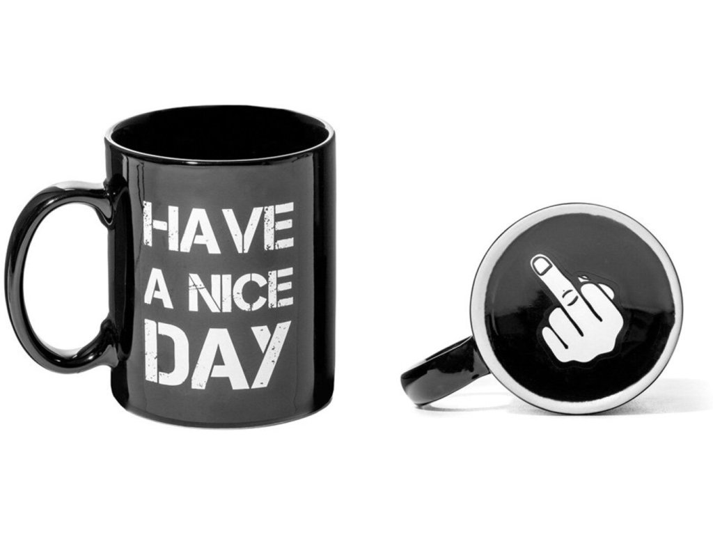 Radi niekomu vyrážate dych vtipom a nečakanou zápletkou? Potom máme hrnček priamo pre Vás. Hrnček - Have a nice day sa skvele hodí ako ľuďom s veľkým zmyslom pre humor, tak aj hanblivejším, o ktorých viete, že je niekto v ich blízkosti skryto štve. Jedná sa o veľmi žartovný hrnček s nápisom Have a nice day as potlačou na spodnej strane. Preto keď z neho Vy alebo Vami obdarovaný pije, musí vedieť s kým pijete, aby nenastalo nejaké to faux pas. Pri pití vyvstane na povrch nečakaná pointa tohto hrnčeka. Tento unikátny hrnček je keramický glazovaný v dvoch prevedeniach a to, čierny s bielou potlačou alebo biely s čiernou potlačou. Poteší každého, kto má zmysel pre humor.