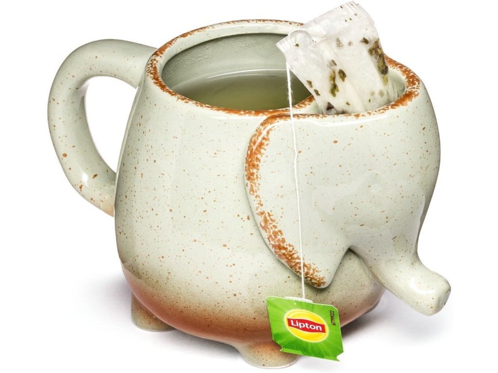 - s vreckom na použitý čajový sáčok v hlave slona