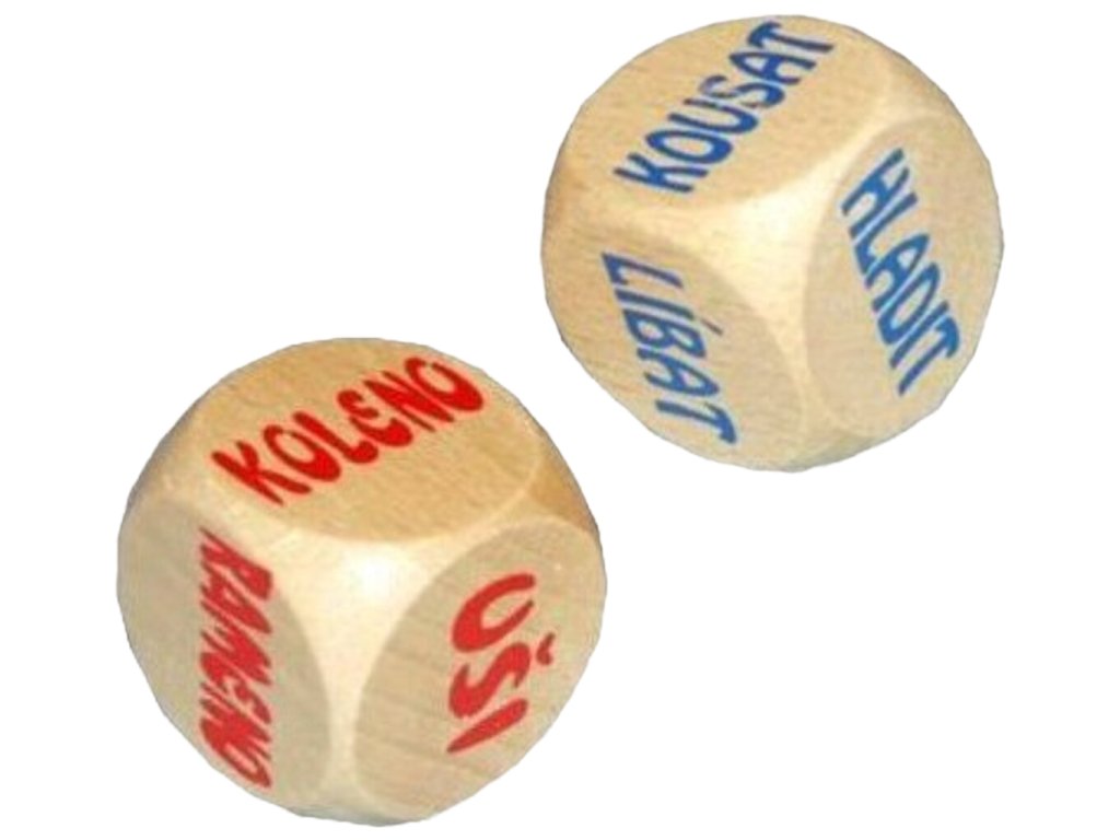 Užite si v spálni so svojou drahou polovičkou trochu napätia a kúpte si tieto kocky duo sexy , ktoré Vám presne poradia s akou časťou tela svojej lásky máte čo robiť. K dispozícii máte dve kocky . Jedna obsahuje časti tela: Koleno, Rameno, Uši, Ruky, Pery a otáznik. A druhá obsahuje činnosti: Hryzať, Lízať, Hladiť, Dotýkať sa, Bozkávať a otáznik. Pokiaľ Vám na kocke padne otáznik, je len na Vás, ktorú časť tela a činnosť si vyberiete. Zahrajte si túto zaujímavú hru s kockami a vneste do svojej spálne trochu vzrušenia. Kocky duo sexy sú originálny darček pre zamilovaných .