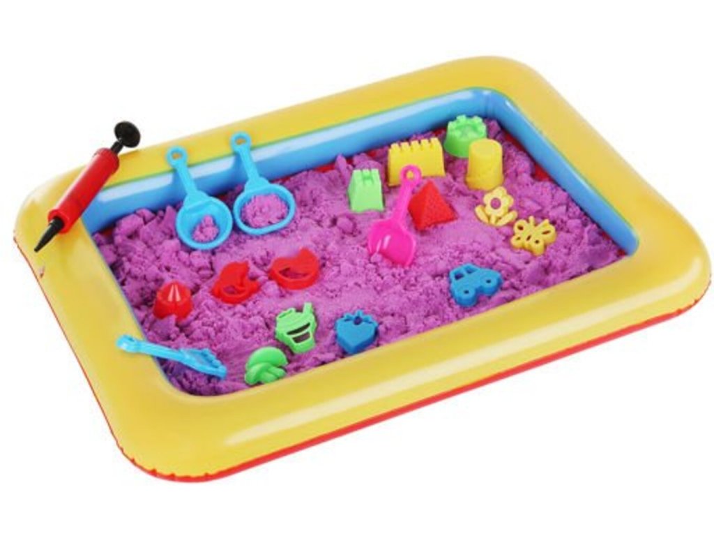 Detský piesok s magickými kinetickými vlastnosťami je nápadom ako senzačný darček pre každé dieťa. Taký kinetický piesok je možné úspešne hrať doma. Keď vietor, dážď alebo sneh je za oknom – všetko, čo potrebujete, je krabička kúzelného piesku a nechajte svoju fantáziu pobehovať! Detská piesková súprava obsahuje 14 plastových foriem, hrable, sitá, špachtle a lievik. S takým príslušenstvom sa nebudete nudiť. V sade s kinetickým pieskom je aj nafukovacie pieskovisko, ktoré vám umožní udržiavať poriadok v mieste hry.