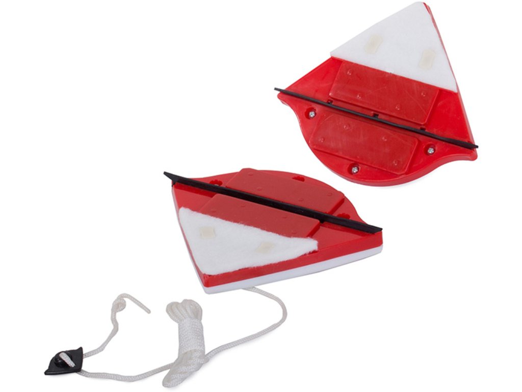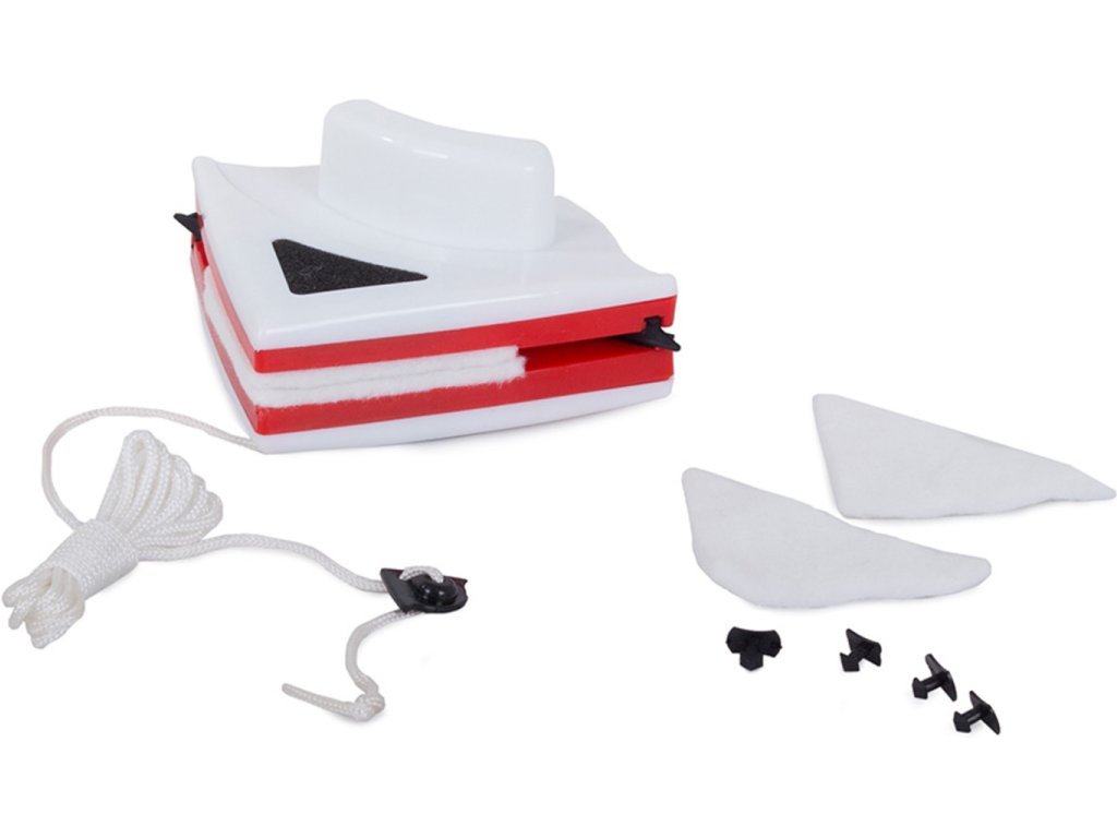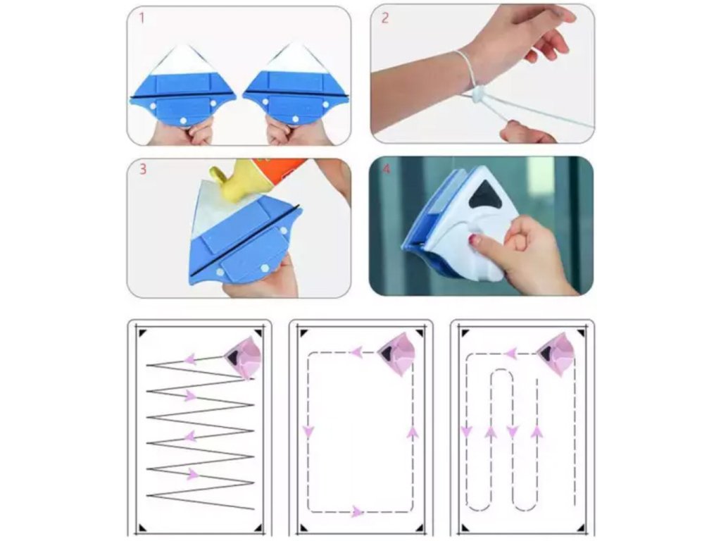 Čistič je vybavený veľmi silným magnetom, vďaka ktorému sa obe časti priťahujú, aj keď je medzi nimi sklenená tabuľa. Musíte pamätať na to, že sklo musí byť hladké a nesmie mať žiadne praskliny. Aby magnet fungoval, hrúbka skla musí byť v rozmedzí 5mm-15mm. Otvorte čistič otočením o 180 stupňov. K časti s rukoväťou je pripevnená šnúrka, pred použitím podložky ju pripevnite k druhej časti. Vďaka tomu máte istotu, že keď sa podložka za oknom odopne, nespadne na zem, zostane na povrázku. Namočte špongiu mydlovou vodou. Umiestnite podložku k oknu - časť s kľukou by mala byť na vašej strane, druhý prvok by mal byť umiestnený zvonku. Pred čistením okna sa uistite, že sa oba prvky vzájomne priťahujú. Potom môžete pristúpiť k umývaniu okien. Keď ju budete chcieť z okna vybrať, posuňte ju až k samému okraju, aby ste dosiahli na obe časti. Uchopte dva prvky a jeden z nich otočte o 180 stupňov.