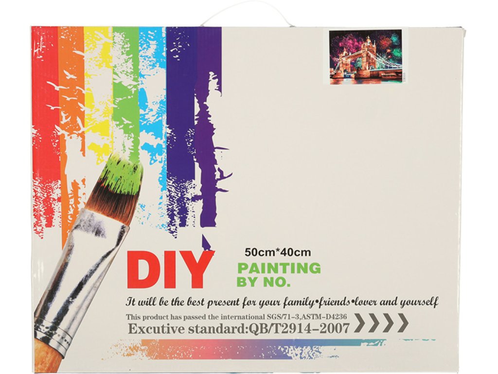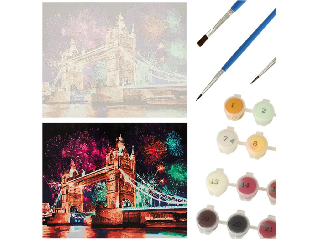 Na to, aby si mohol začať maľovať, nepotrebuješ veľa, pretože potrebné príslušenstvo je už súčasťou balenia - plátno s vytlačeným obrázkom, tri štetce rôznej hrúbky a nádobky na farby. Jediné, čo si musíte pripraviť, je pohár s vodou alebo obrúsky. Množstvo farby dokonale zodpovedá tomu, koľko jej potrebujete na namaľovanie celého obrazu. Takže sa nebojte, farba vám nedôjde! Maľovanie podľa čísel dokonale rozvíja manuálne zručnosti - maľovanie políčok farbou si vyžaduje veľkú presnosť a dobrý úchop štetca.