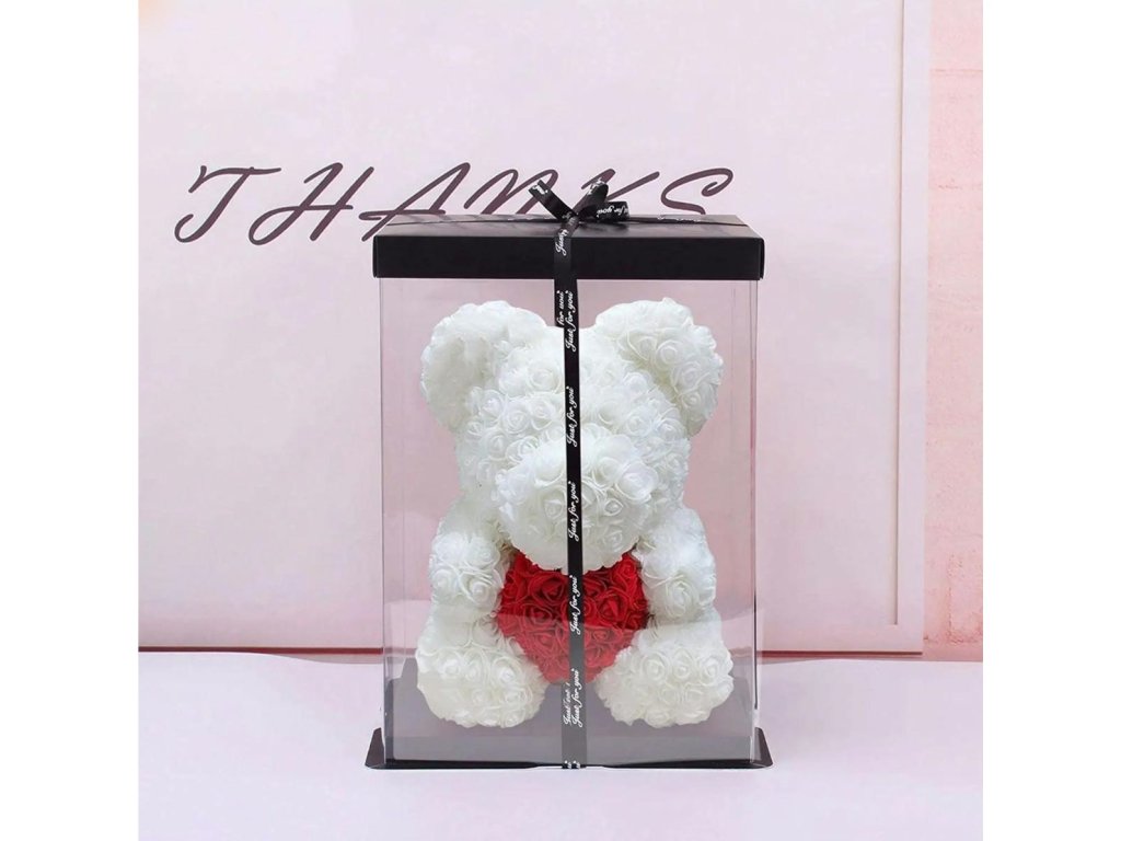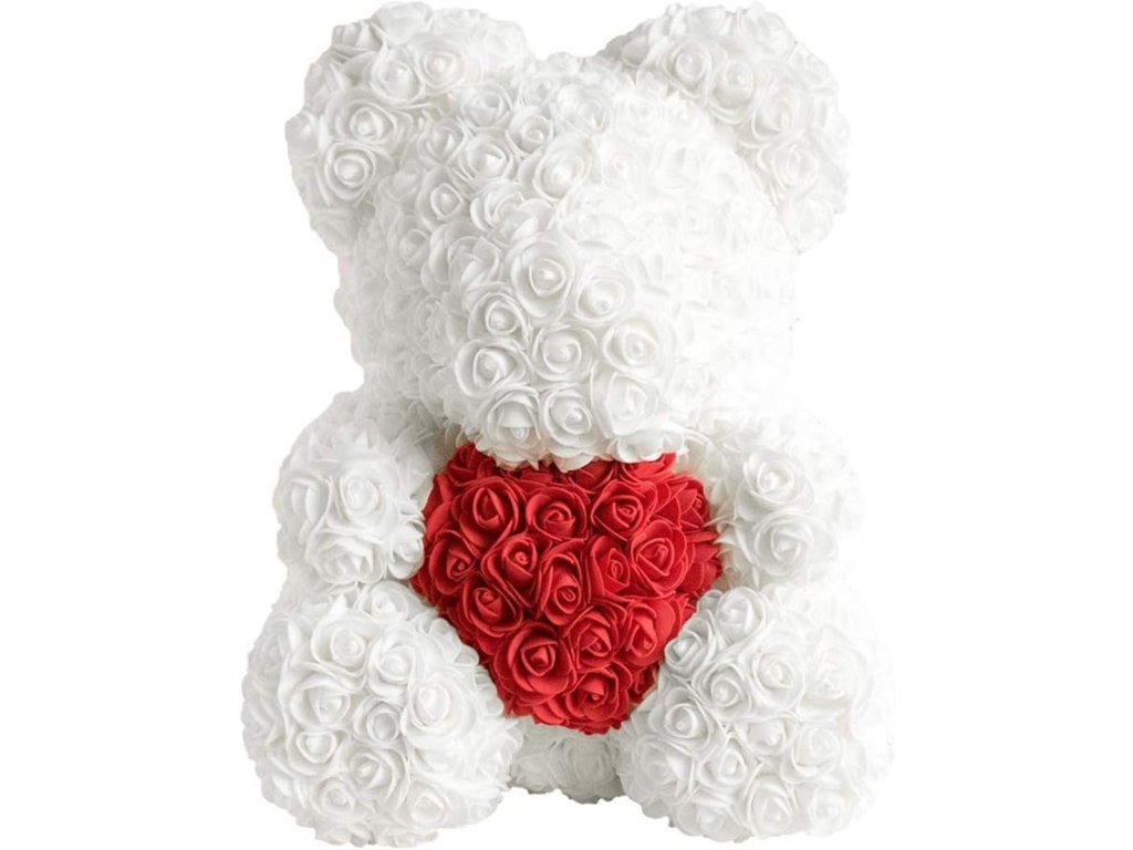 - Medvedík z bielych ruží držiaci červené srdce.