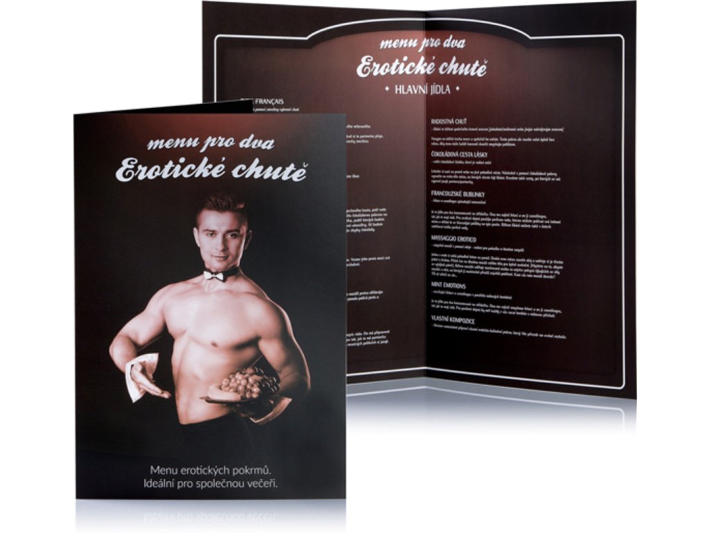 Chcete so svojou láskou zažiť naozajstný erotický zážitok , ktorý naladí všetky Vaše chuťové bunky? Až budete svojmu partnerovi servírovať večeru , nechajte mu uprostred stola toto špeciálne menu , v ktorom si po dobrej večeri je možné vybrať ešte jeden chod. Lahodný erotický zákusok , ktorý dodá celému večeru romantické zakončenie. Menu pre dvoch erotických chutí je zábavná erotická hra pre dvoch zamilovaných , ktorí si chcú trochu okoreniť milostný vzťah . V tomto menu nájdete tie najlepšie predjedlá, hlavné chody, nápoje aj dezerty v podobe erotických masáží , vzrušujúcich sexuálnych polôh a aktov . Vychutnajte si napríklad Krémový bozk alebo sladkú Čokoládovú cestu lásky . Táto báječná erotická hra vnesie do Vašej spálne veľa skúseností a príjemných chvíľ so svojou láskou . Menu pre dva erotické chute je originálny darček a skvelá erotická hra pre zamilovaných , ktorí radi nevšedné darčeky .