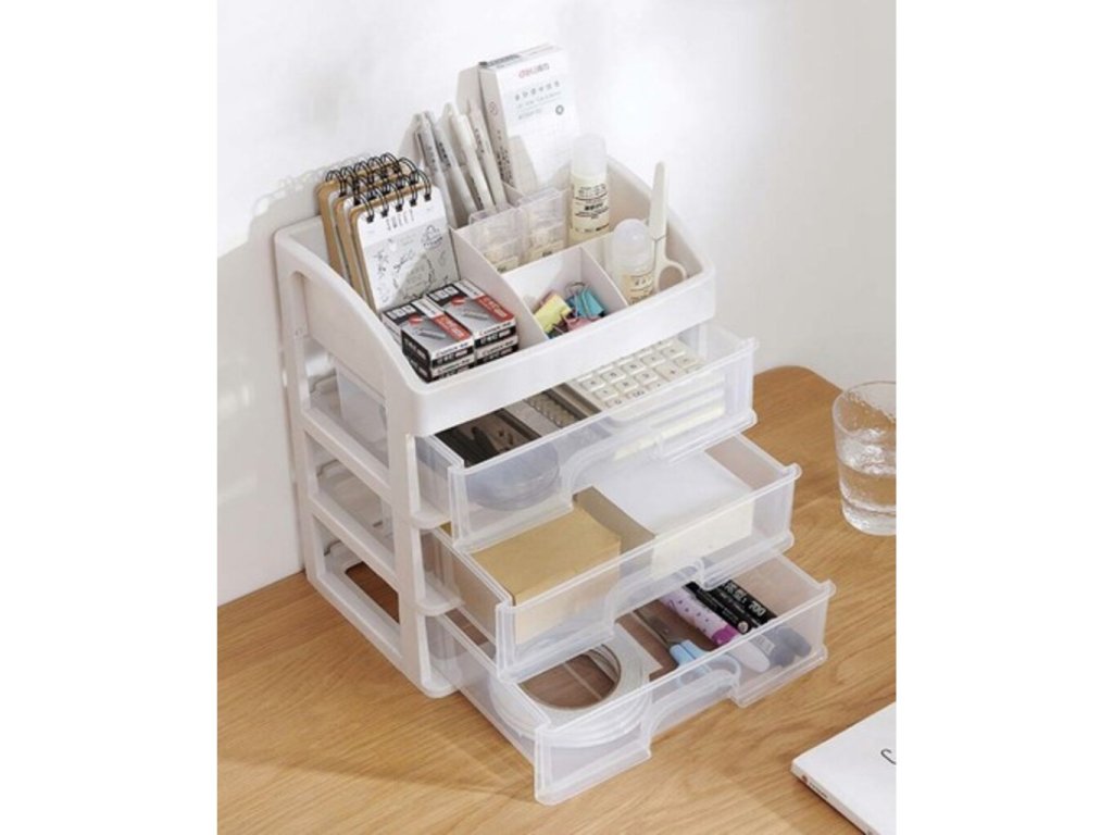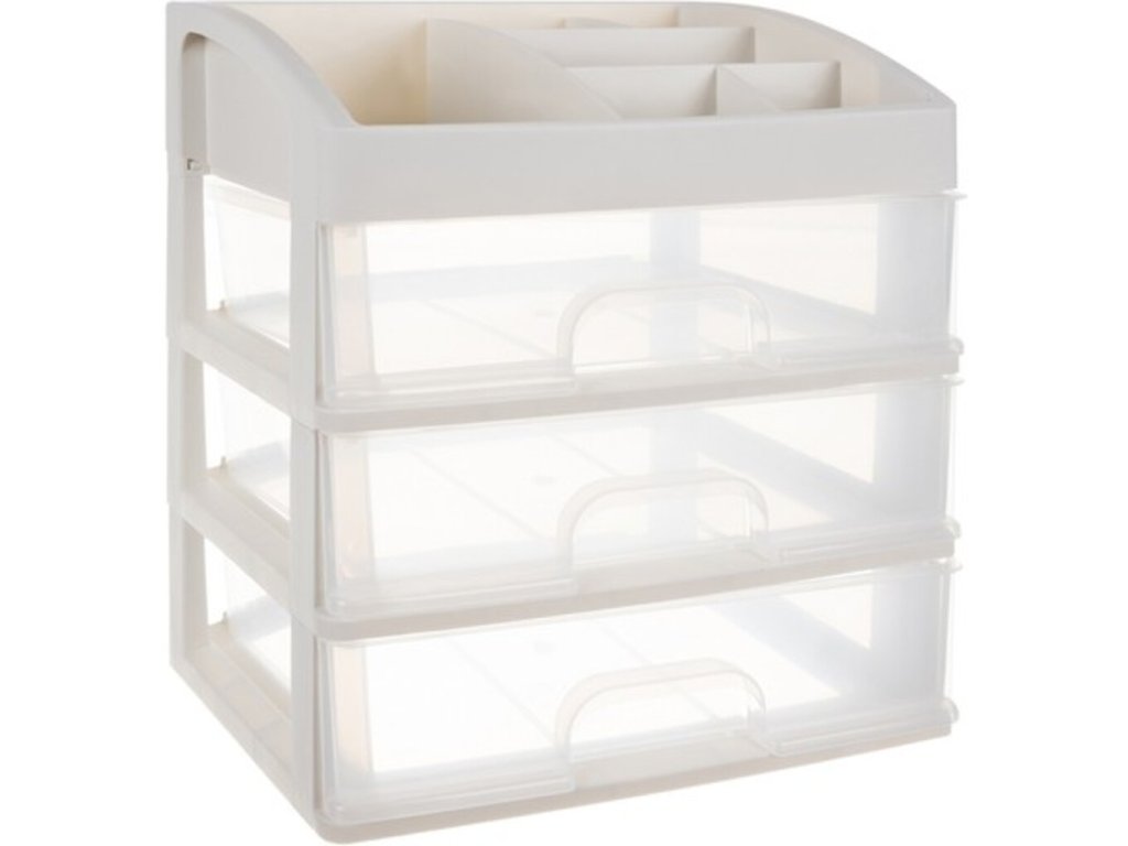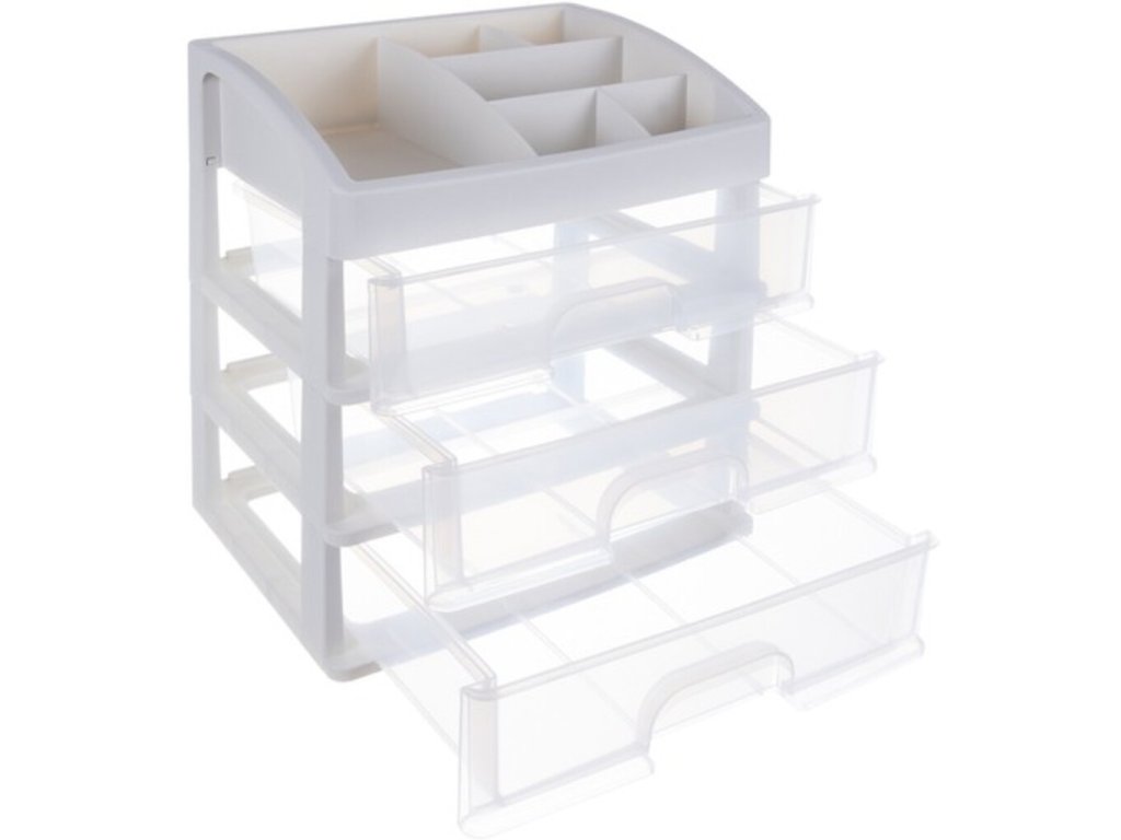 Organizér je vyrobený z priehľadného materiálu, vďaka ktorému jasne vidíte, čo je vo vnútri, takže môžete rýchlo nájsť predmet, aby ste naň dosiahli. Má 3 priehľadné zásuvky rovnakej veľkosti. Horná časť je navyše rozdelená na segmenty, v ktorých si môžete kozmetiku prispôsobiť. Má až 6 rôznych priehradok v rôznych veľkostiach. Organizér poslúži ako na uloženie kozmetiky, rôznych druhov šperkov, ale aj kancelárskych potrieb, drobnej elektroniky, skrutiek, matiek apod. Uplatnenie nájde v kuchyni a kúpeľni, ale aj v iných miestnostiach. Umožní vám udržiavať poriadok a odpadne váš problém s hľadaním správneho rúžu alebo bronzera. Každý produkt bude na svojom mieste. Je to skvelý pomocník, ktorý navyše pomáha udržiavať kozmetiku v poriadku . Pokiaľ si ceníte pohodlie a chcete mať svoju obľúbenú kozmetiku alebo šperky po ruke, je tento organizér práve pre vás.