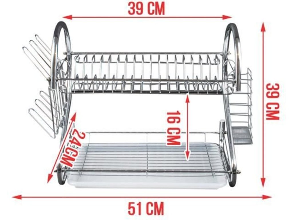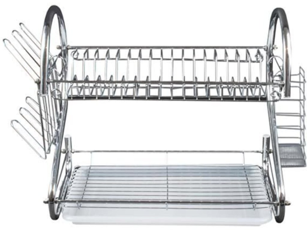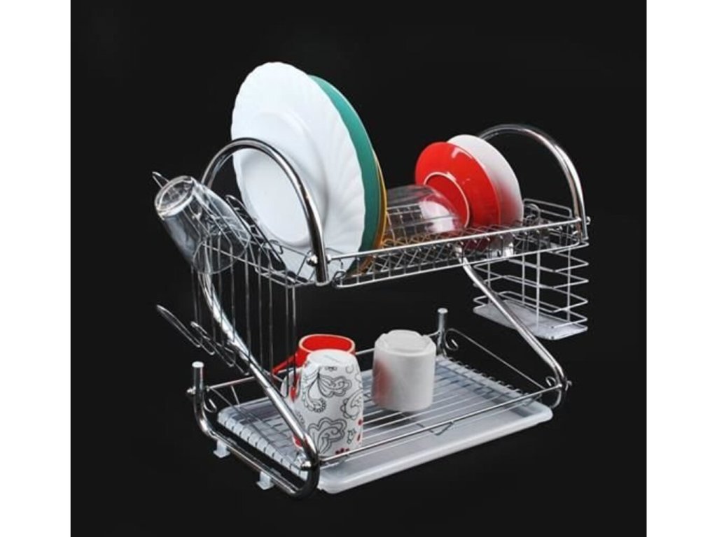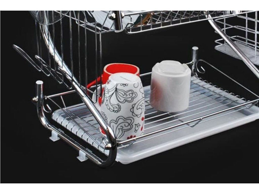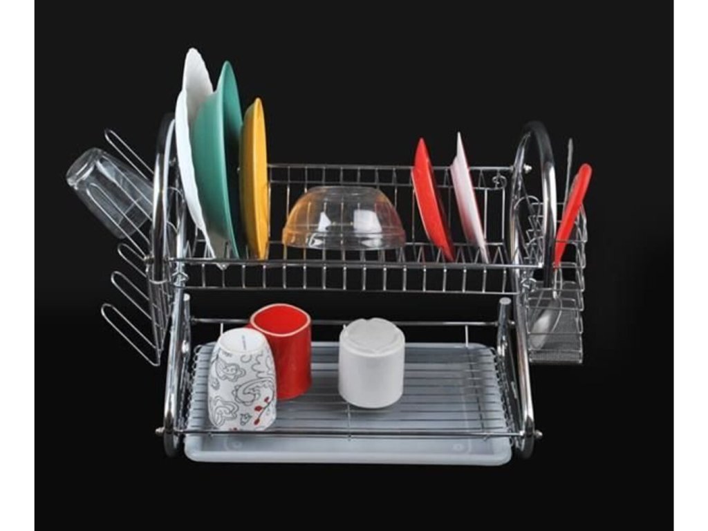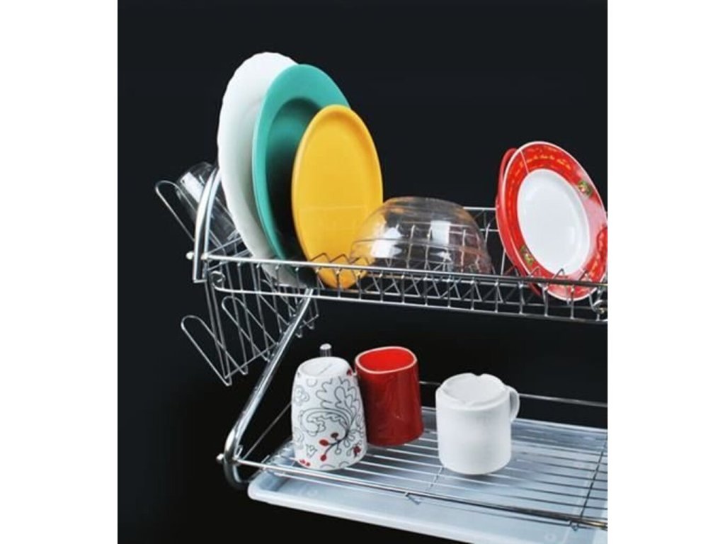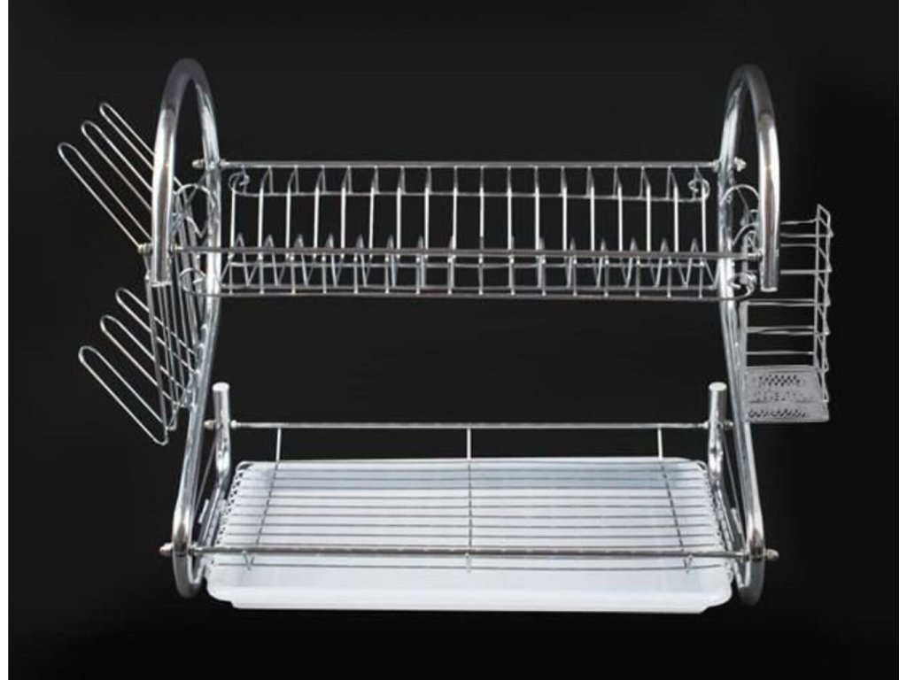 Vynikajúci Poschodový odkvapkávač na riad (chróm). Horné poschodie má priestor pre 17 tanierov . Spodná časť je naopak určená pre misky, hrnčeky, hrnce atď. Odkvapkávač je stabilný, odolný voči zvýšenej vlhkosti. Vďaka modernému a elegantnému dizajnu bude Poschodový odkvapkávač ozdobou vašej kuchyne! Súprava obsahuje odnímateľnú odkvapkávaciu misku na príbory a poháre - stačí ju zavesiť na bočné priečky odkvapkávača. Je možné ich ľubovoľne meniť a odstraňovať.
