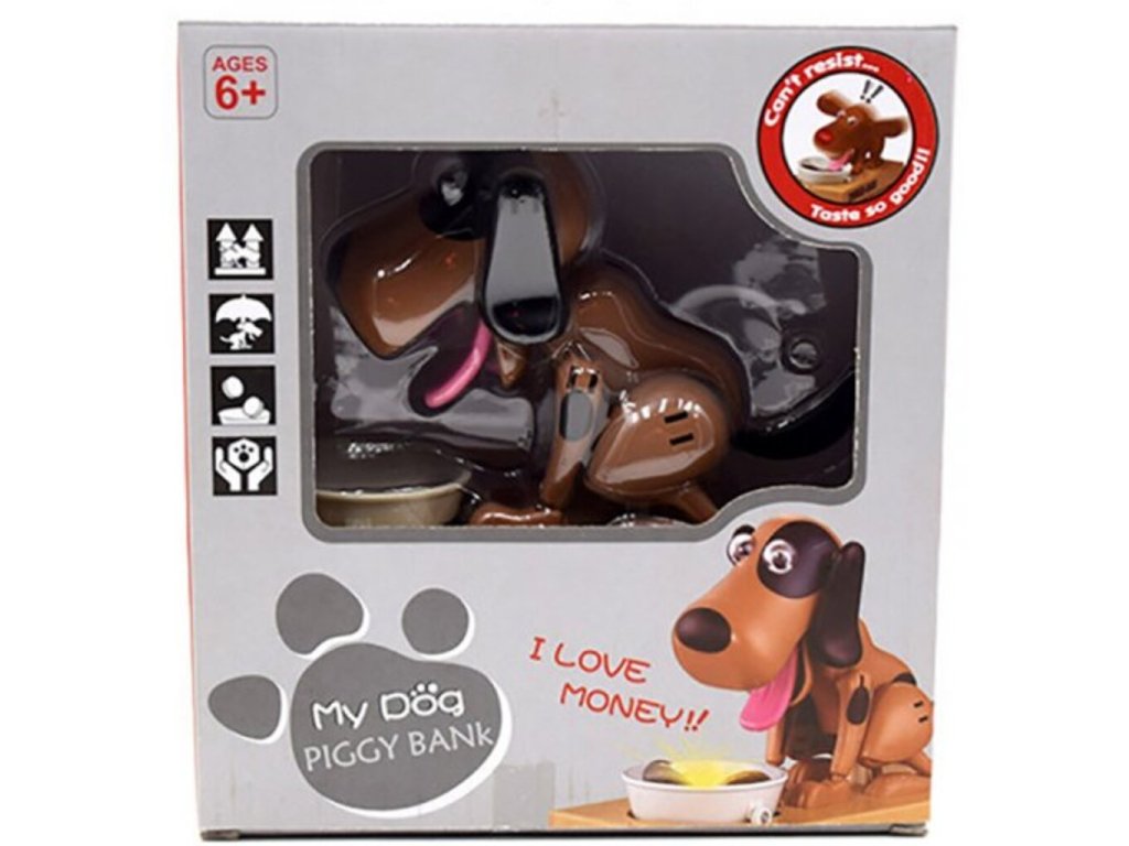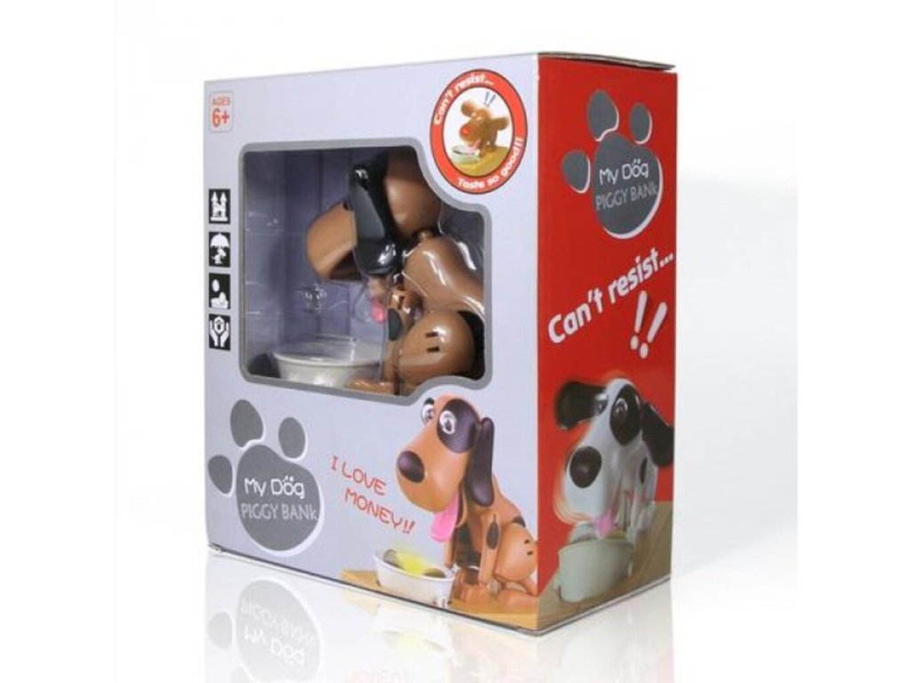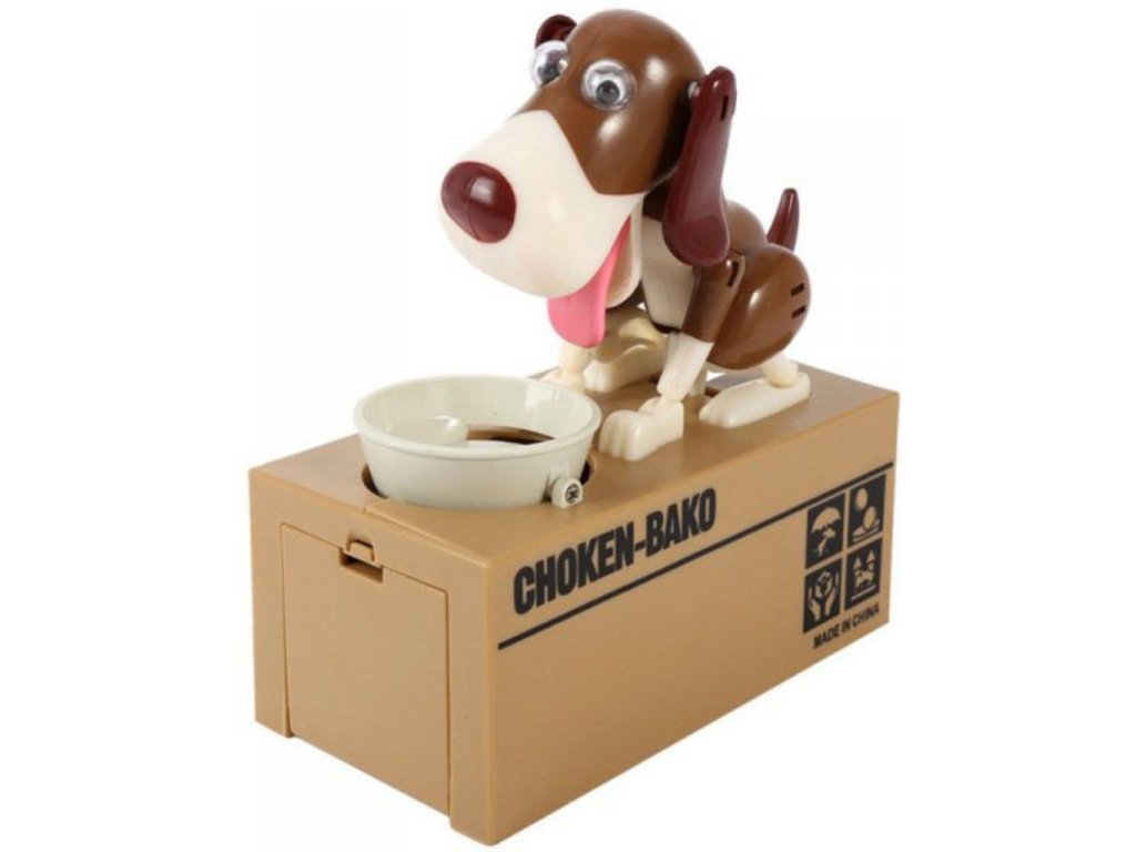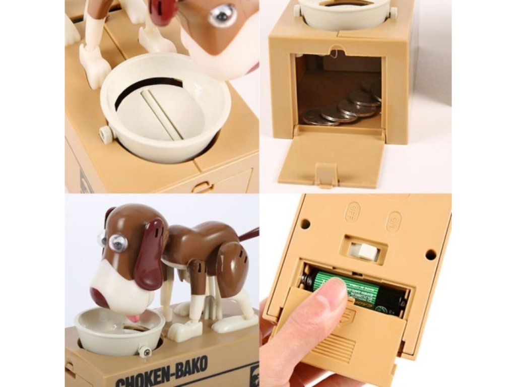 Potešte svoje deti touto roztomilou pokladničkou na drobné so psíkom . Tento psík je veľmi hladný a keď mu dáte drobné , zlupne ich ako malinu. Pri jedení mince vydáva psík hlasné zvuky, aby ste vedeli aký veľký má hlad. Tento roztomilý zážitok si zaiste nenecháte ujsť a pre Vaše deti bude tento malý psík skvelou motiváciou, ako šetriť peniaze. Dajte psíkovi mincu do mištičky a uvidíte, s akou chuťou ju zlupne. Psíkova pokladnička na drobné je originálny darček pre deti .