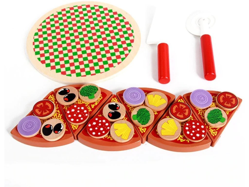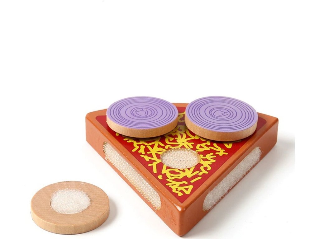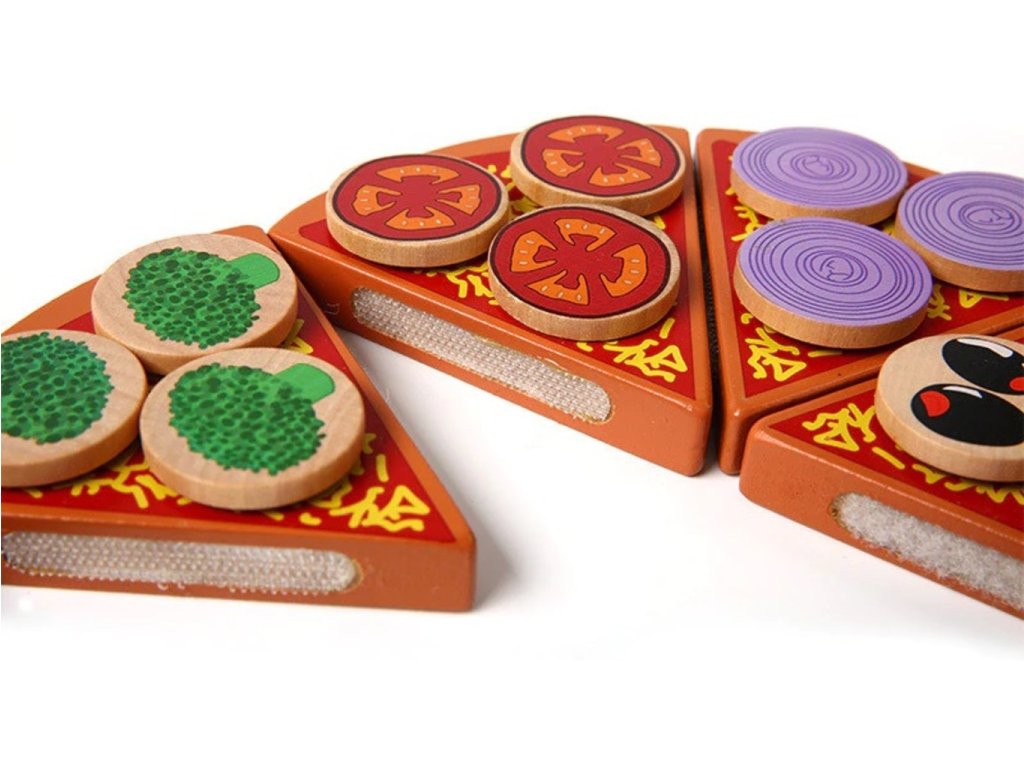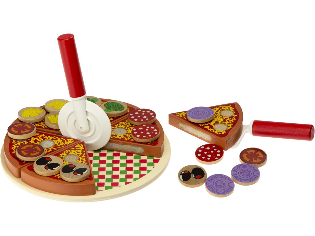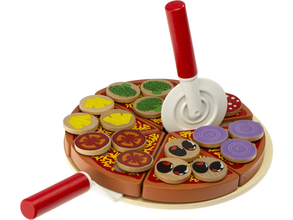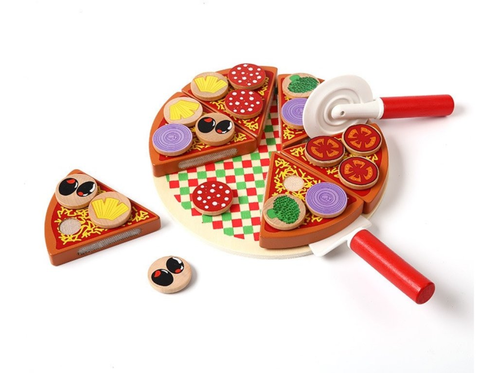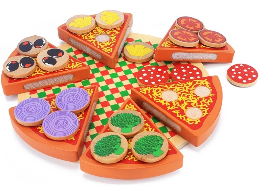 Súprava na samozdobenie pizze. Hračka je celá vyrobená z dreva . Jednotlivé prvky pizze je možné spájať pomocou pripevneného suchého zipsu. Výborná hračka, ktorá určite osloví malého kuchára. Vďaka zapínaniu na suchý zips je možné rezať priloženým nožom. Hra má pozitívny vplyv na rozvoj manuálnych zručností dieťaťa. Stimuluje kreatívne myslenie a kreativitu . Vaše dieťa si bude môcť ozdobiť podľa svojich predstáv. Skvelá zábava pre celú rodinu. Balené v estetickej kartónovej krabici.