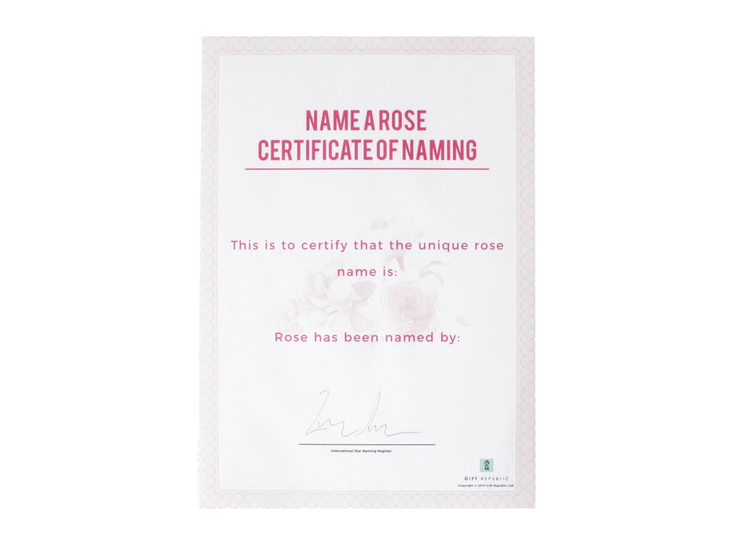 Ženy milujú kvety, darujte im preto jedinečnú možnosť pomenovať ružu podľa svojich túžob. V balení spolu sa dostanete certifikát na jej pomenovanie . Po vyplnení certifikátu podľa návodu bude meno Vašej ruže zanesené do medzinárodného registra. Urobte radosť svojej milej týmto jedinečným romantickým darčekom . Nádherný darček pre vašich blízkych!
