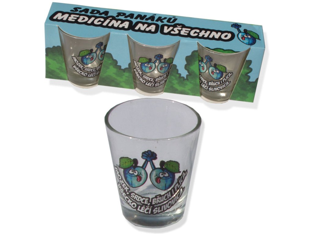 Hovorí sa, že panák slivovice je liek na všetko. Darujte svojmu kamarátovi túto štýlovú sadu panákov – liek na všetko , na ktorých sú vytlačené roztomilé slivky . Len s týmito panákmi si môžete pripiť na zdravie výbornou slivovicou a vychutnať si ju. Pripite si na zdravie Vášho srdca, mozgu, brucha, skrátka všetkého, čo Vás napadne. Tieto panáky slúžia skutočne na zapitie zdravie . Panáčik do jednej nohy, do druhej nohy... a budete zdraví ako rípa. Sada panákov - liek na všetko je originálny darček pre kamaráta k narodeninám , alebo na párty .