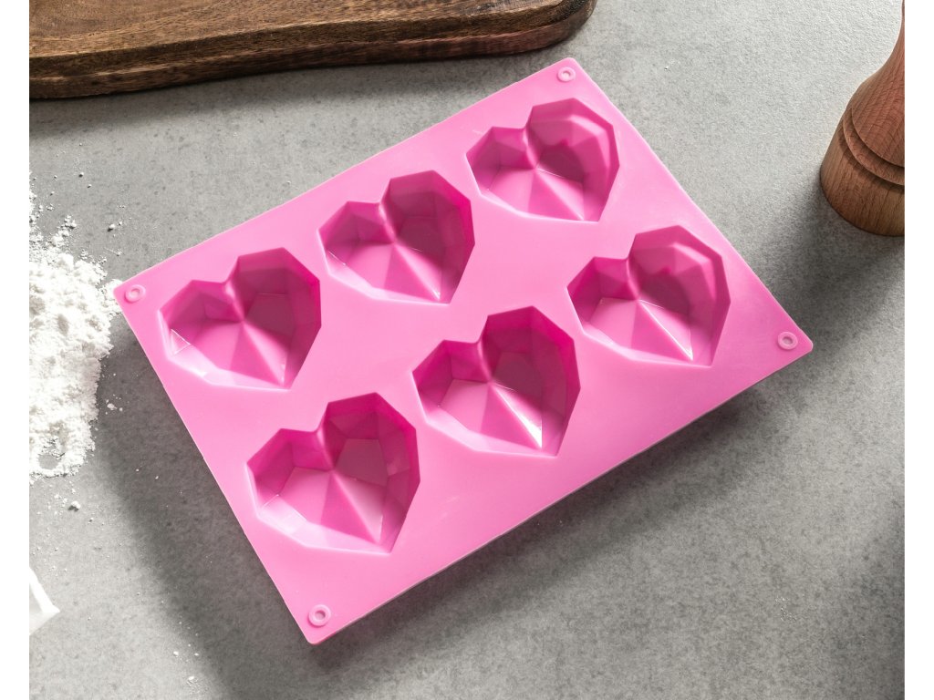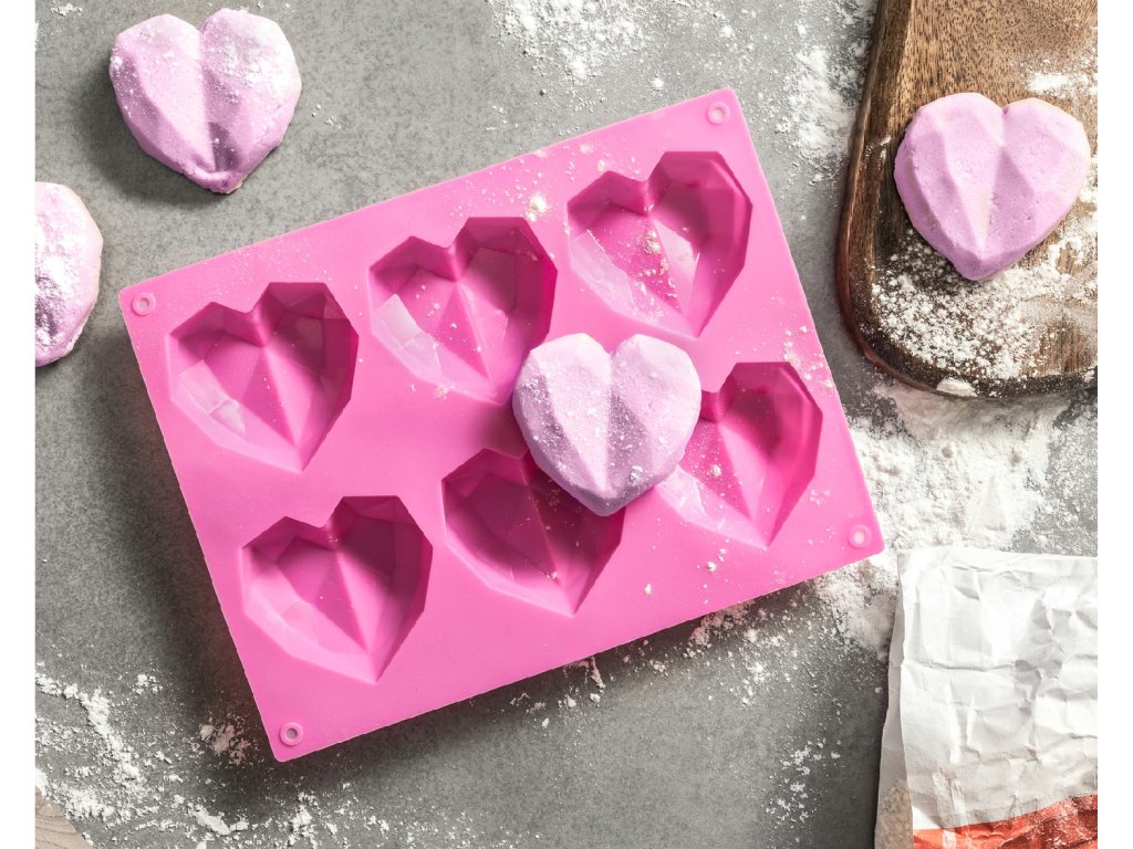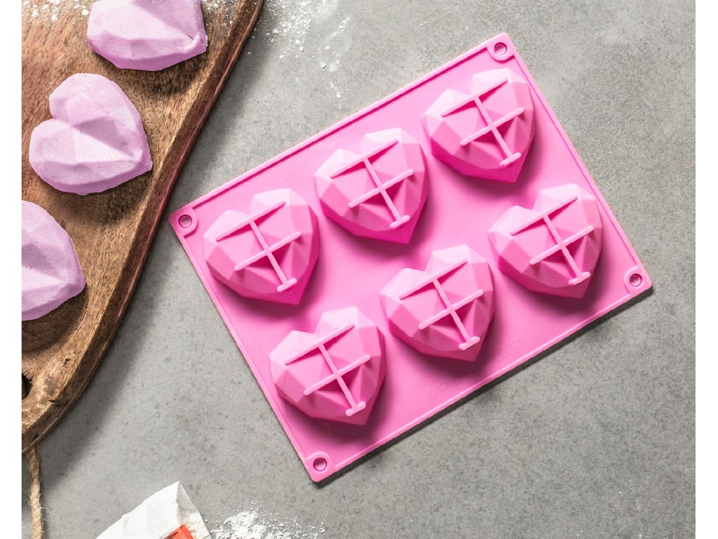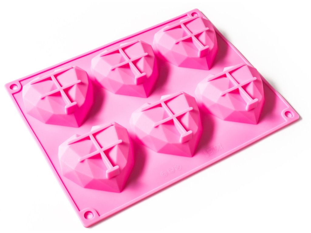 Unikátna ružová Silikónová forma na pečenie muffinov - 3D srdiečka, ktorá vám umožní upiecť moderné srdce k mnohým výnimočným príležitostiam ako sú svadby, výročia, Valentín, večierky a mnoho ďalších. Môžete z neho vyrobiť aj čokoládové srdiečka alebo dokonca... mydlo :) Forma je vyrobená z kvalitného silikónu bez zápachu určeného na styk s potravinami a odolného teplotám do 230 stupňov Celzia. Forma vám umožní piecť srdiečkové muffiny s moderným nerovným povrchom, ktoré môžete rôzne ozdobiť, ako vám fantázia velí a prekvapiť každého, kto je vášmu srdcu blízky.