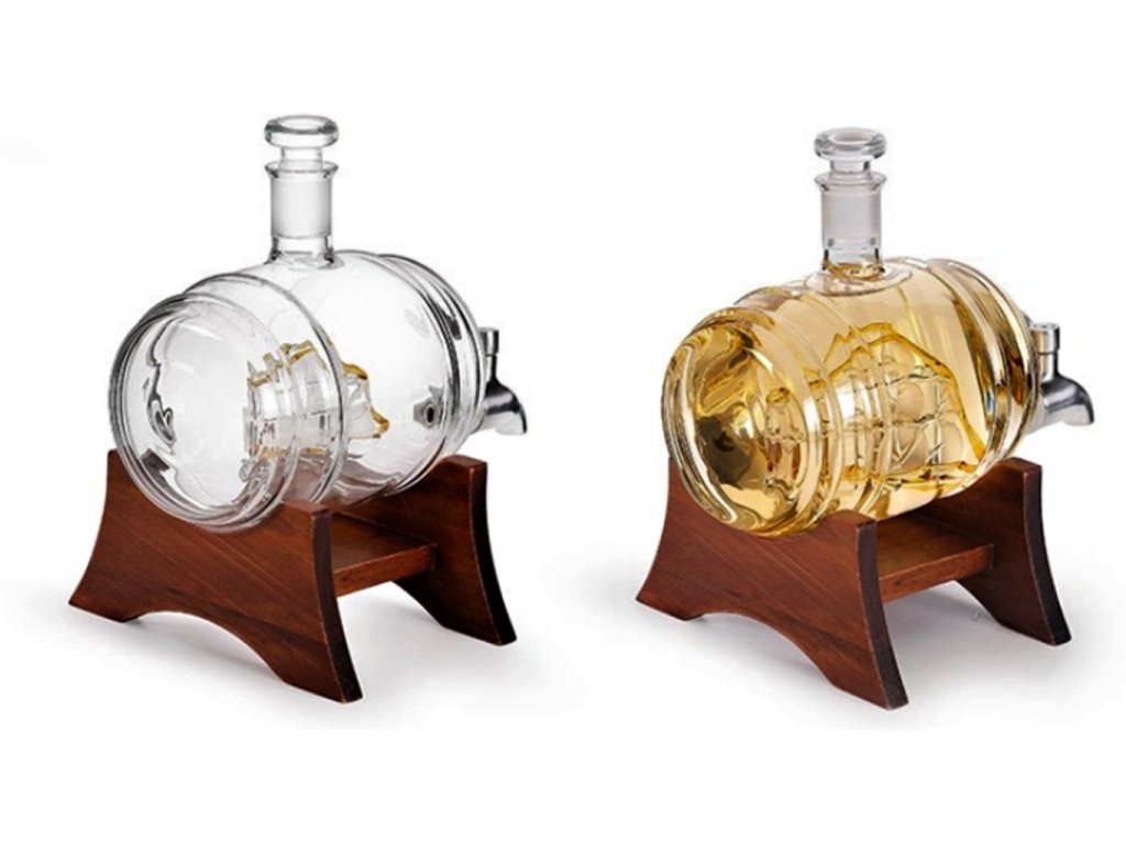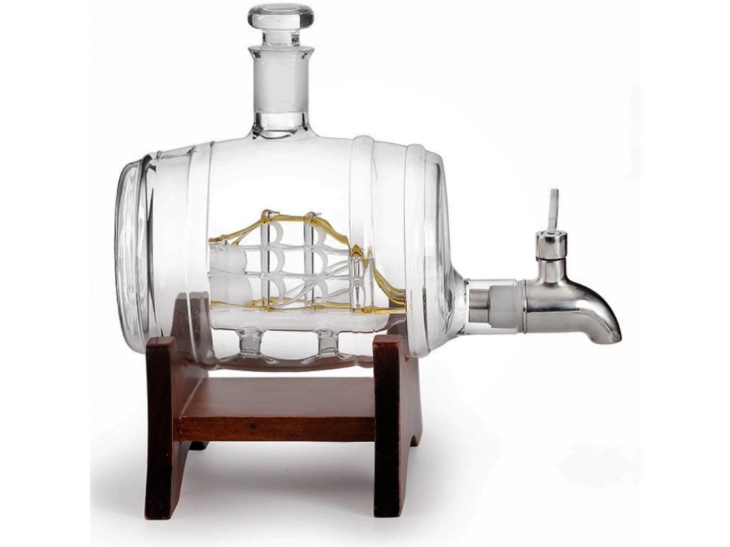 Karafa s objemom 1000 ml na uskladnenie vášho obľúbeného alkoholu - o 50 % väčšia ako podobné karafy. Whisky, škótska, bourbon, koňak, brandy - všetky vaše destiláty budú v našej zlatej karafe vyzerať fantasticky. Je to skvelý darček pre muža, ktorý práve odišiel do dôchodku. Táto karafa na whisky je ozdobou každého stola alebo baru. Plachty a loď majú jantárový odtieň, ktorý z nej robí krásny kúsok karafy.