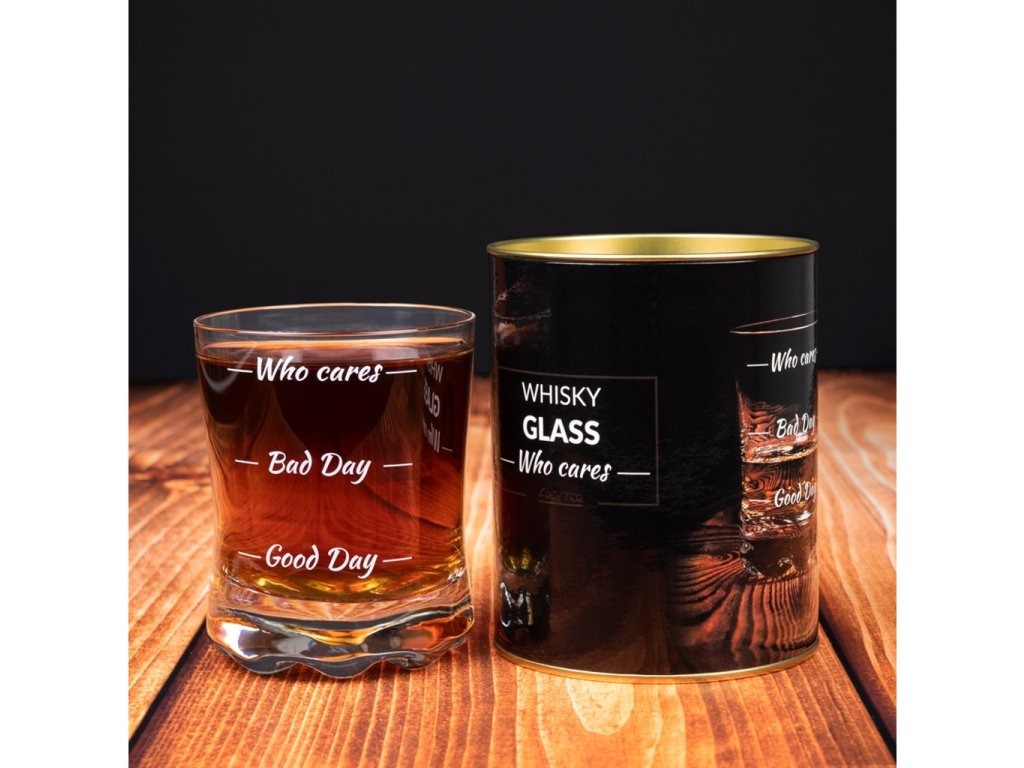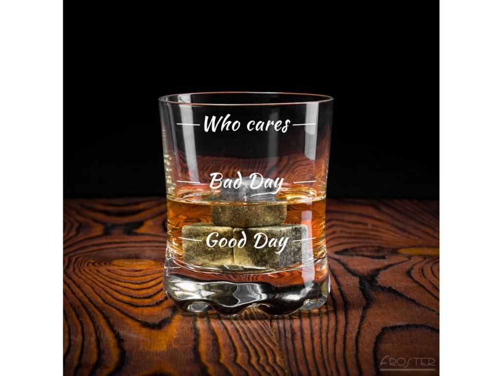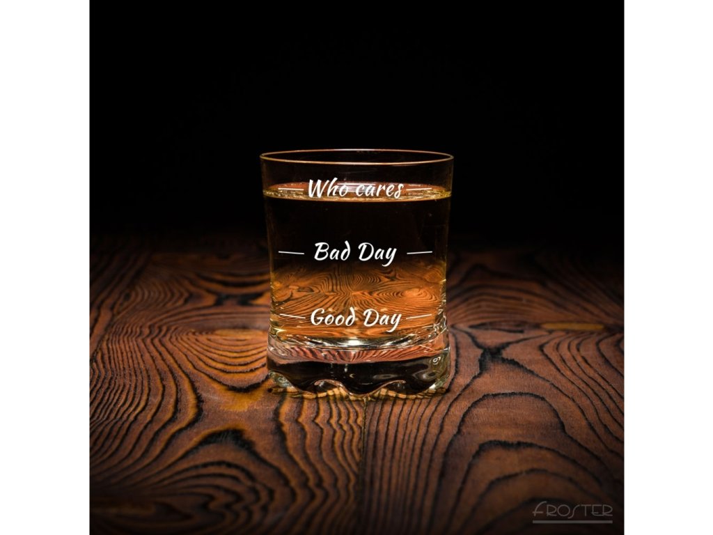 - Poháre whisky s tromi úrovňami: Good Day (dobrý deň), Bad Day (zlý deň) a Who cares (koho to zaujíma)