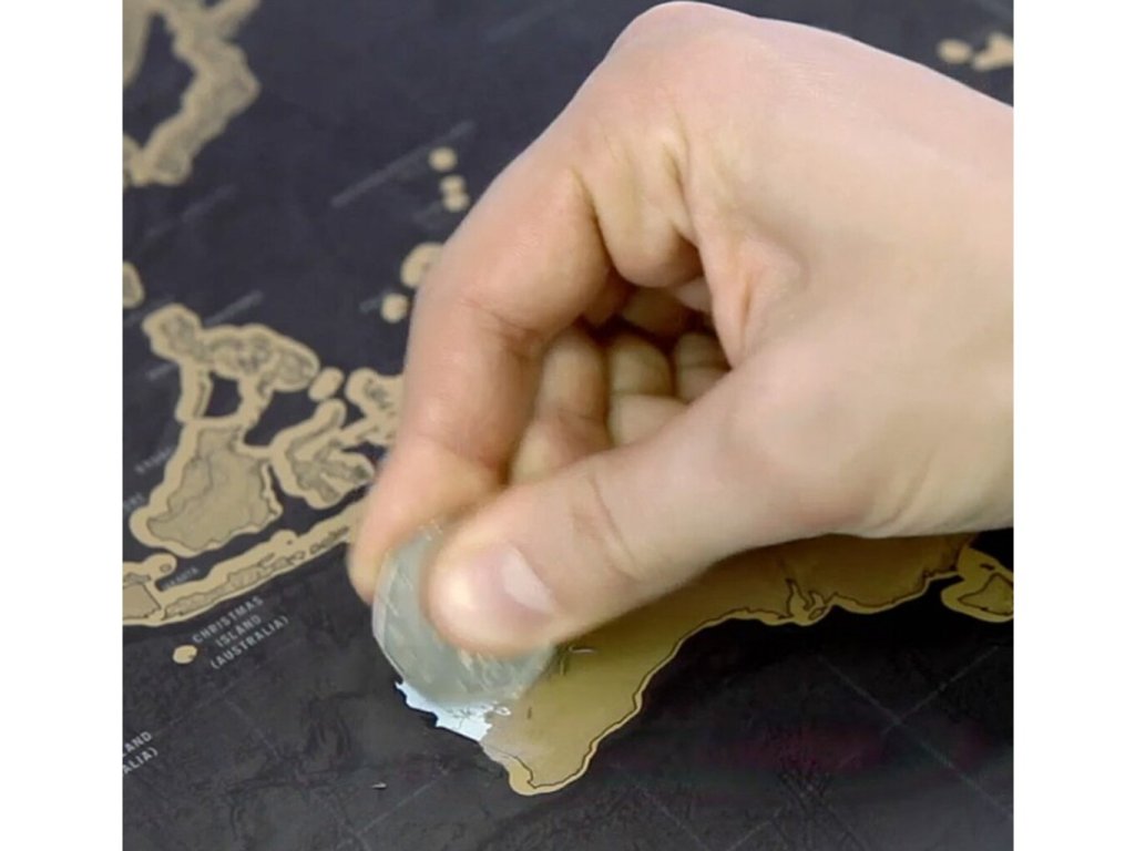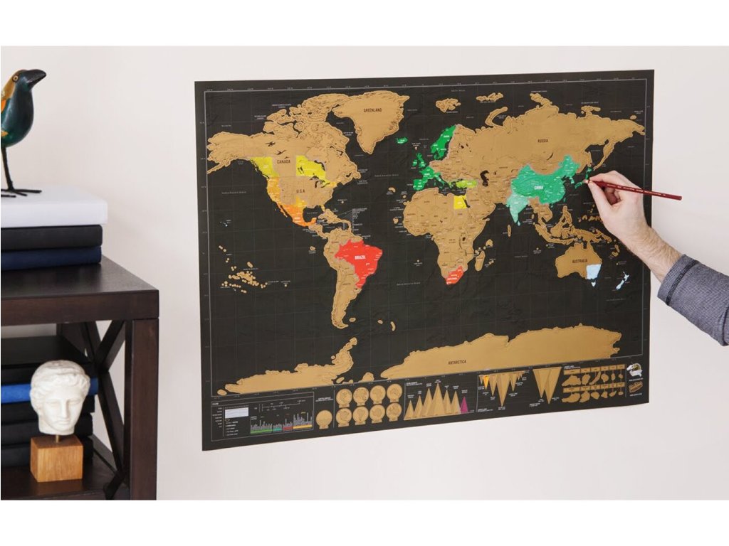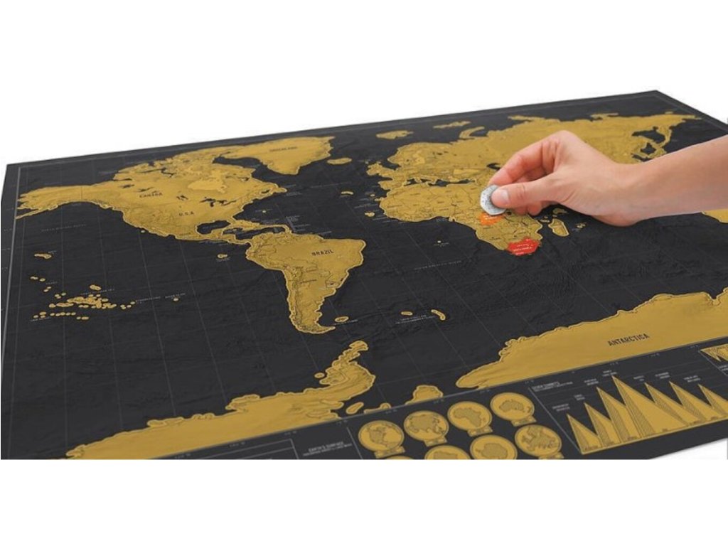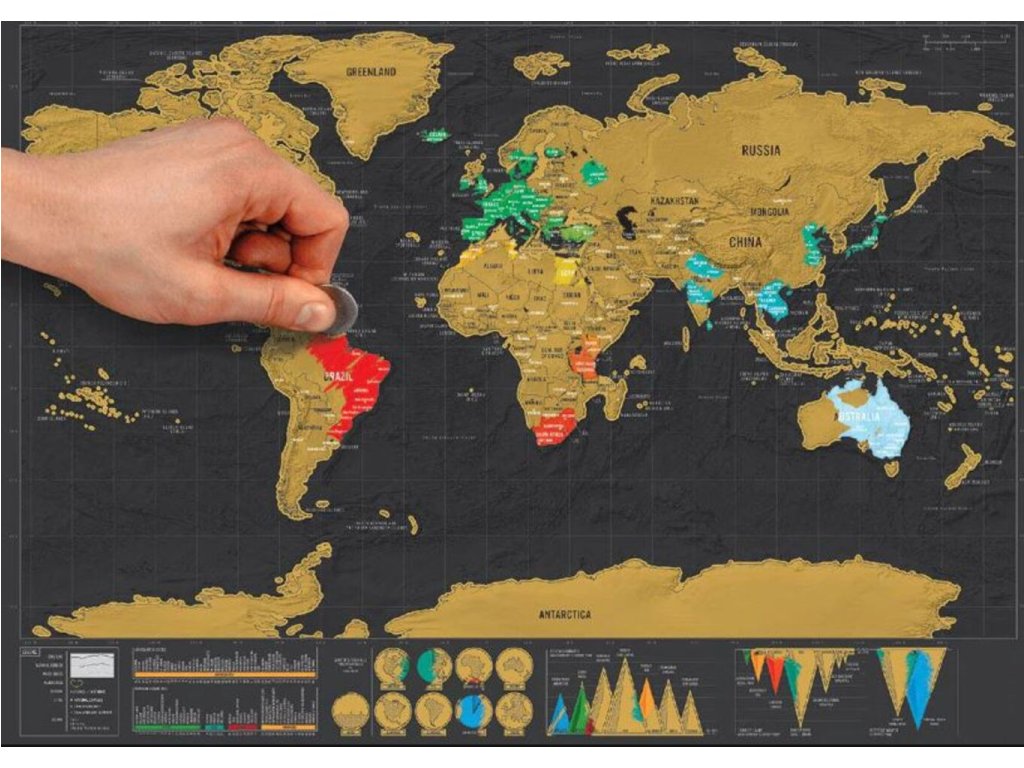 Predstavujeme Vám stieraciu mapu sveta deluxe čierna , ideálny darček nie len pre tých, čo radi cestujú, ale aj pre tých, čo by radi cestovali. Scratch máp je špeciálna mapa sveta , ktorá je pokrytá stieracou hliníkovou fóliou . Stačí hrubším predmetom zotrieť túto zlatistú farbu, ako pri stieraní žrebu, a objaví sa farebné zobrazenie štátov. Takto si môžete na mape označovať miesta, ktoré ste navštívili, miesta, ktoré by ste navštíviť chceli, alebo miesta o ktorých sa práve učíte v škole. Odhalíte veľké množstvo faktov a informácií o krajine a oceánoch. Urobte týmto darčekom radosť nie len sebe, ale aj tým, ktorí chcú objavovať svet . Stieracia mapa sveta deluxe čierna je originálny darček pre každého.
