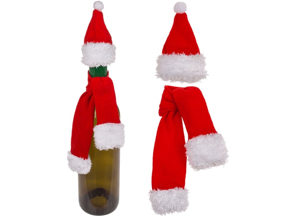 Sada na zdobenie fliaš - čiapka Santa a šál. Skvelá dekorácia pre sviatočný stôl a skvelý nápad na ozdobenie darčeka. Sada pomôže vytvoriť slávnostnú atmosféru vianočného stola alebo párty.